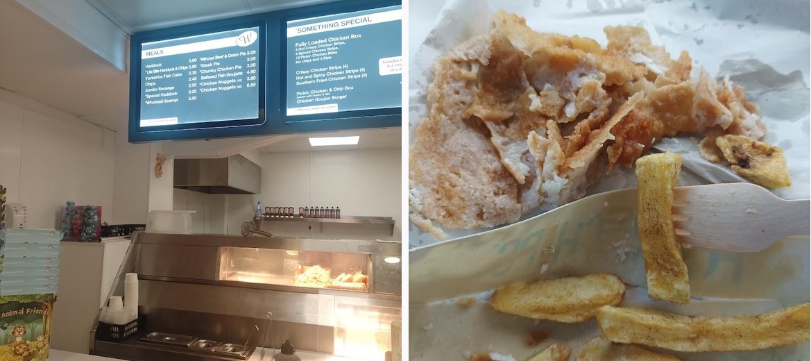 I don't know if they tasted so good because we were so hungry, but they really hit the spot. Batter was good, not too greasy. Good to see that they're using cardboard trays rather than polystyrene, bit if, like me, you like to ladle on the vinegar, you need to either eat very quickly or have some protectiom between the box and your clothes! Friendly service. Open later than most chippies every night.